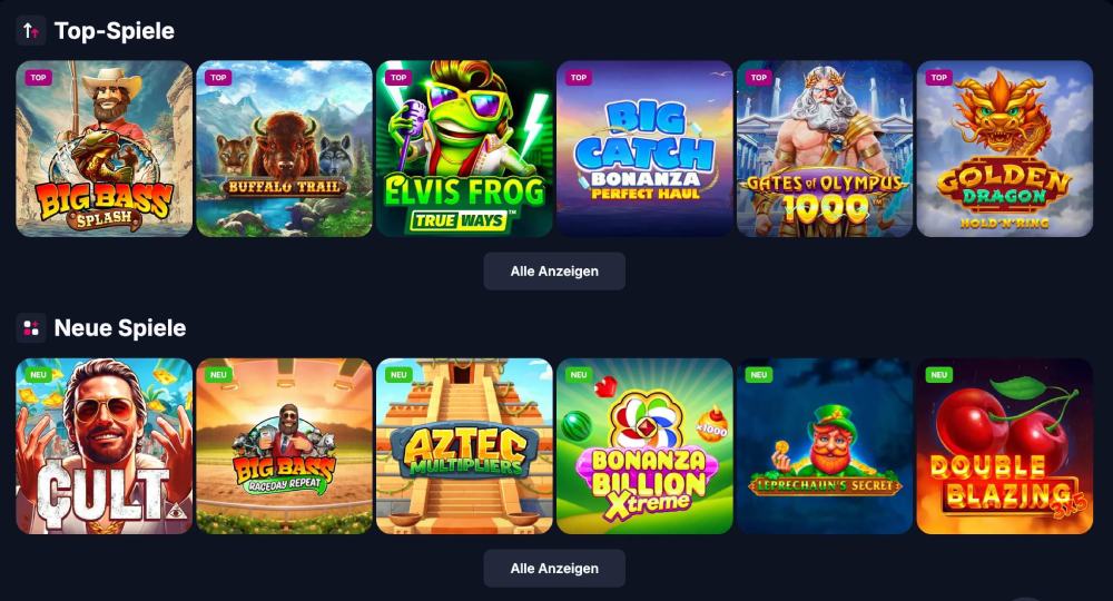 Das Spieleangebot umfasst Slots, Tisch- und Kartenspiele, Crash-Games, Sofortgewinn-Spiele, Rubbelkarten und Live-Spiele.