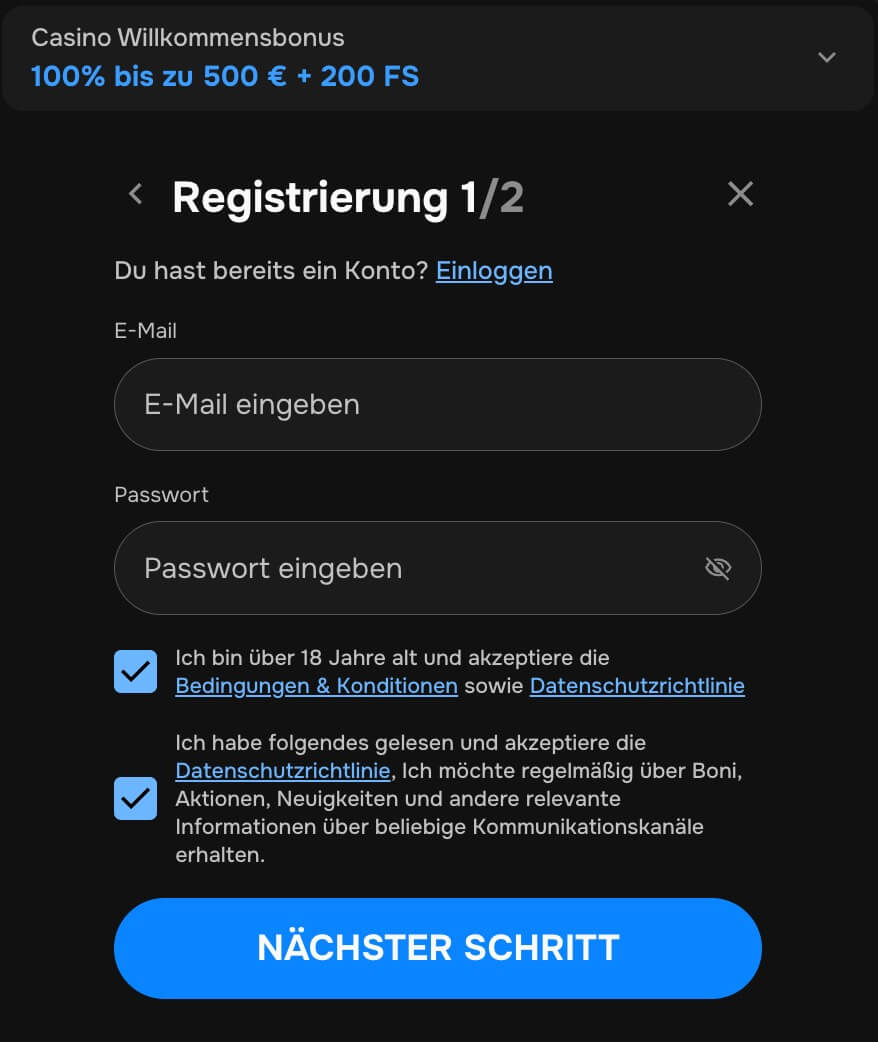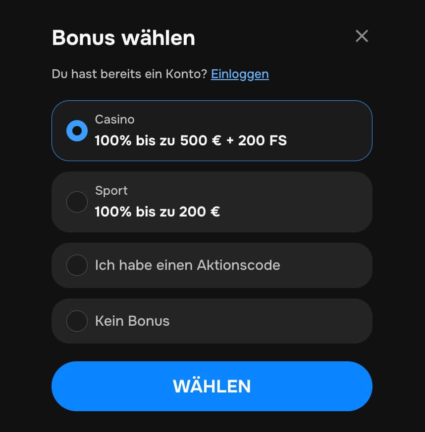 - Bonus auswählen: Wähle eines der angebotenen Willkommensangebote aus oder trage (falls verfügbar) einen Promocode ein.