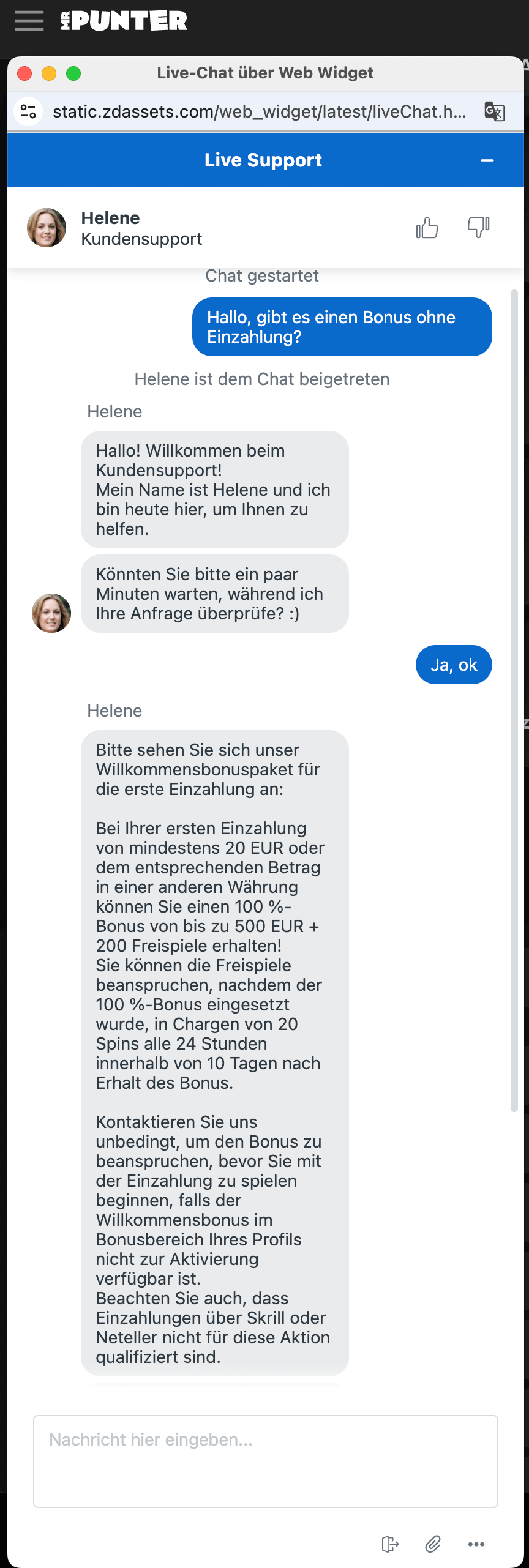 Im Rahmen meiner MrPunter Bewertung habe ich den Kundenservice selbst ausprobiert und mich über den Live-Chat an das Support-Team gewandt. Nach dem Abschicken meiner Frage erhielt ich etwa 15 Minuten später eine Rückmeldung.