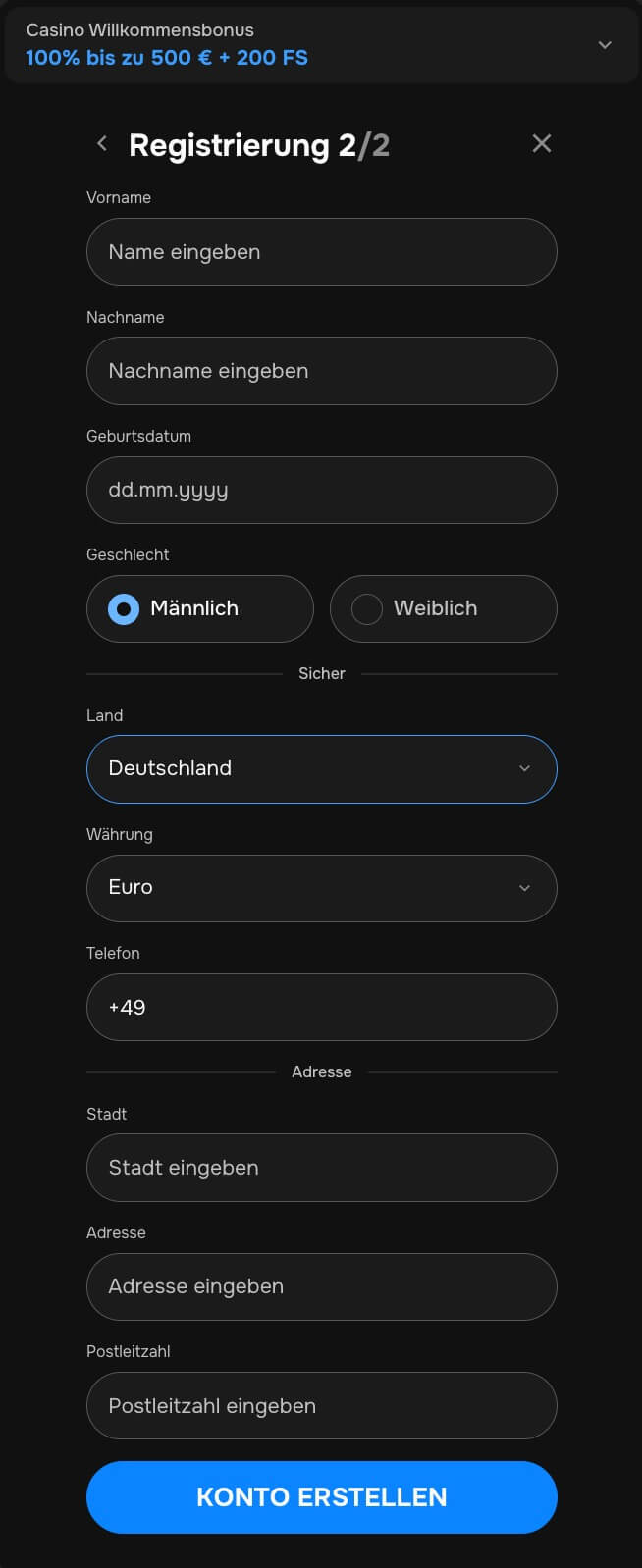 - Persönliche Angaben eingeben: Fülle die erforderlichen Felder mit Deinen persönlichen Daten wie Name, Geburtsdatum, Wohnadresse und Land aus.