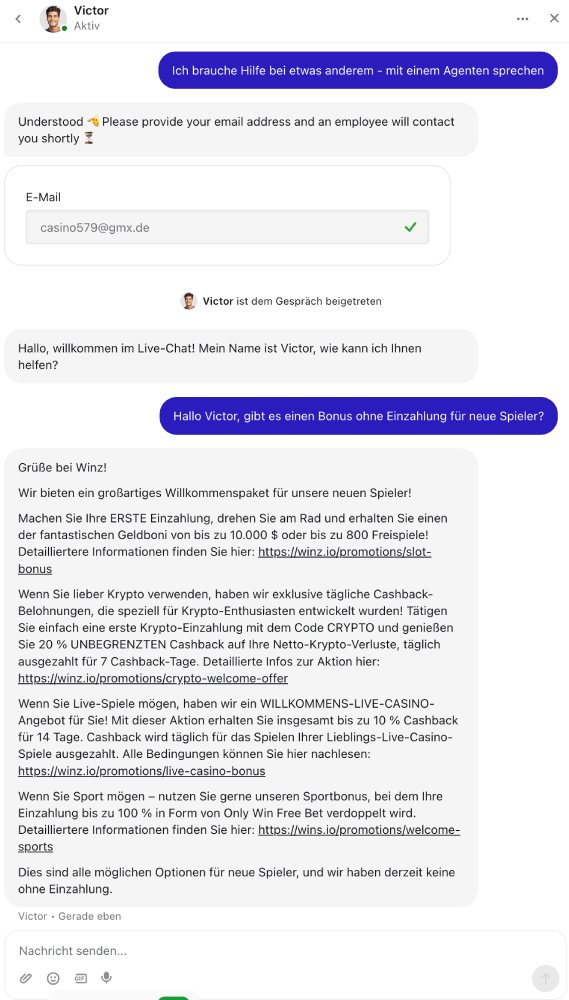 Bei meinen Winz.io Erfahrungen habe ich den Live-Chat getestet. Zu Beginn antwortet ein Bot, Du kannst Dich aber an einen Mitarbeiter weiterleiten lassen, wenn die automatischen Antworten nicht hilfreich sind.